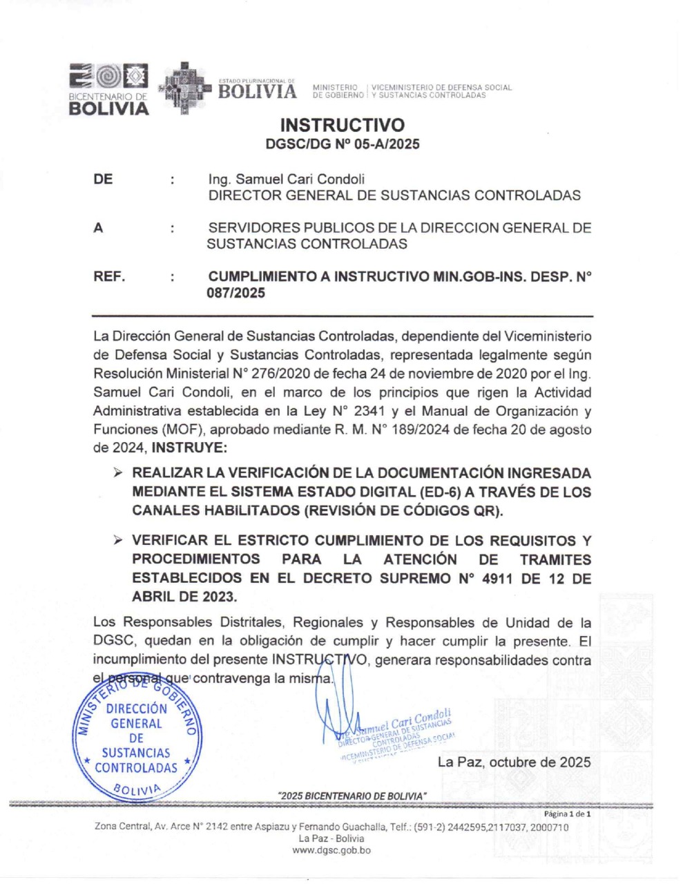 de Sustancias Controladas (D.G.S.C.) dependiente del Viceministerio de Defensa