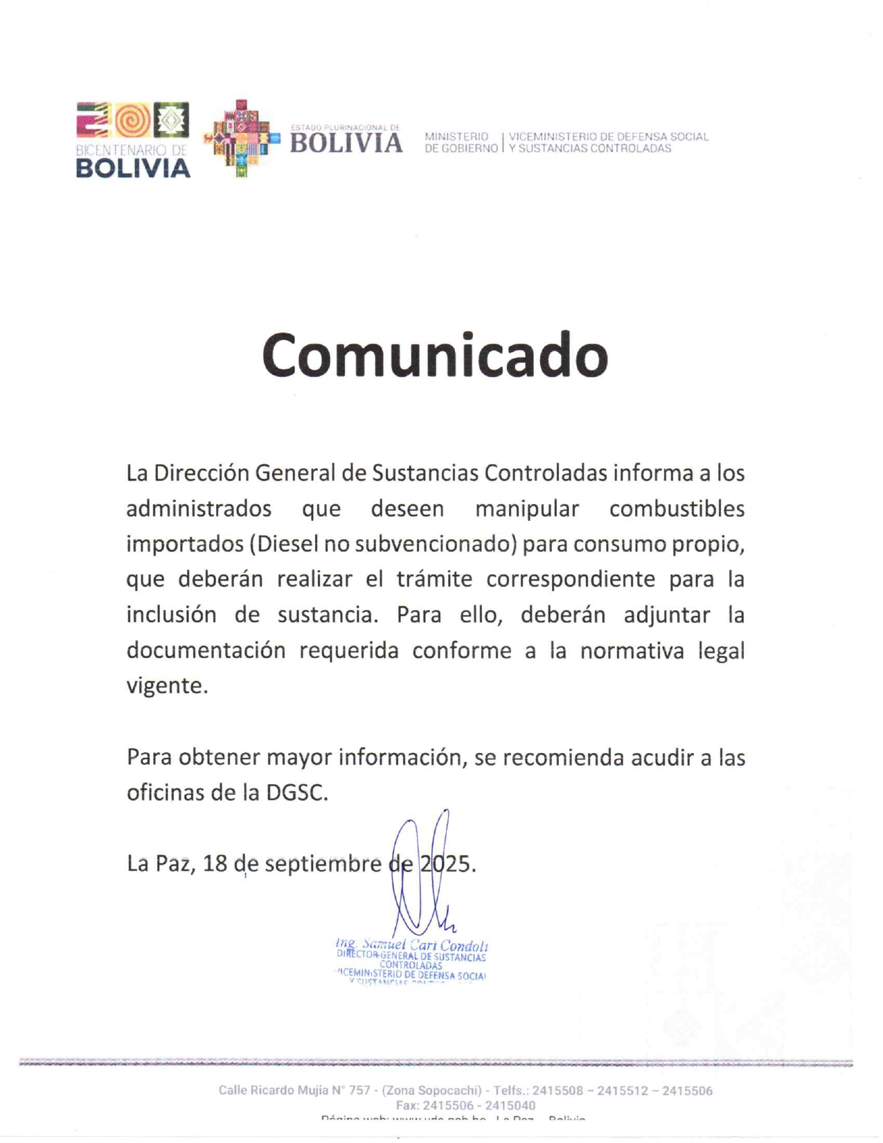 de Sustancias Controladas (D.G.S.C.) dependiente del Viceministerio de Defensa